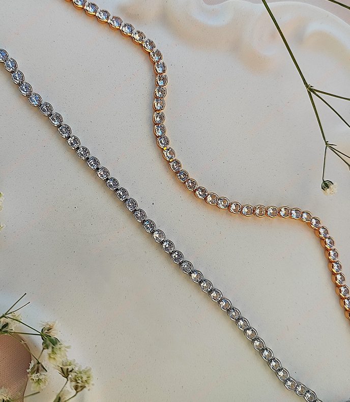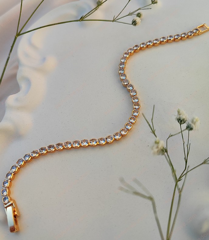 دستبند تنیسی با دانه ای های الماسی شکل ظریف، از کارهای بسیار زیبا و جذاب بازار است که میتواند هدیه ای بیاد ماندنی برای عزیزانتان باشد. جنس بسیار با کیفیت و ماندگاری رنگ بالا دارد و در دو رنگ نقره ای و طلایی ملایم موجود است.