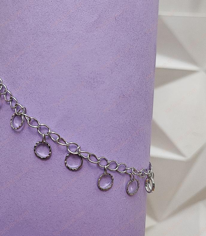 پابند زیبای ریسه حلقه ای در عین سادگی جلوه ای خاص به پای شما می بخشد. بسیار راحت و سبک است و از جنس استیل رنگ ثابت می باشد. در ضمن به دلیل سادگی این مدل، همیشه ترند بوده و برای همیشه و همه جا می توان از آن استفاده کرد.
